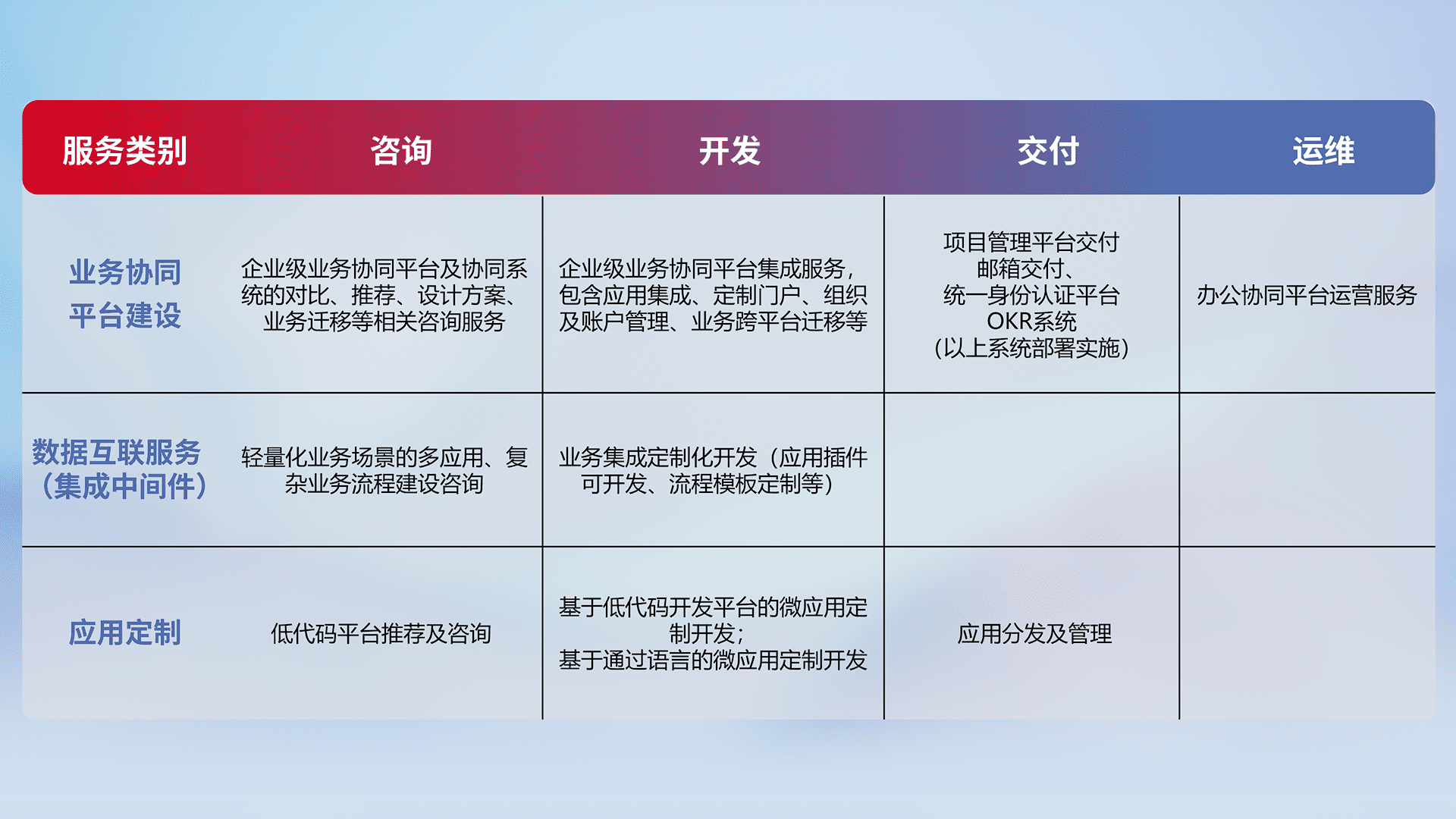 针对钉钉、、、、企微、、IDaas等平台级产品提供产品的规划、、、、方案、、交付、、、、定制化开发等服务,,,实现如统一协同办公、、、、智能客户服务、、、混合会议管理、、、、智能数据查询、、、、等业务场景,,,,实现数字化转型。。