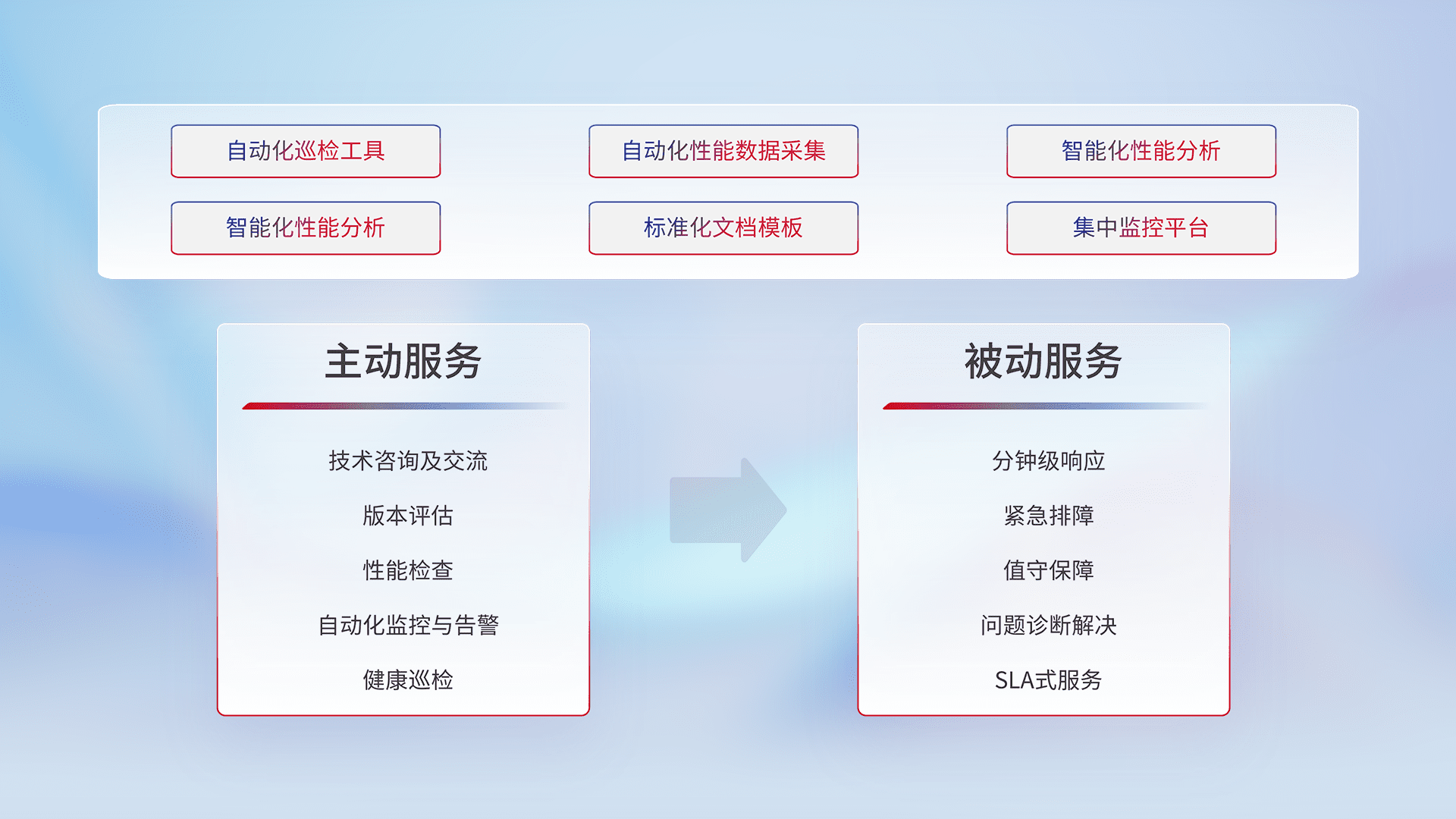 智能化工具和标准化文档,,,,保障服务质量,,提供主动服务(包含技术咨询、、版本评估、、、性能检查、、、自动化监控与告警、、健康巡检)和被动服务包含(分钟级响应、、紧急排障、、、值守保障、、、问题诊断解决、、、、SLA服务)。。。。